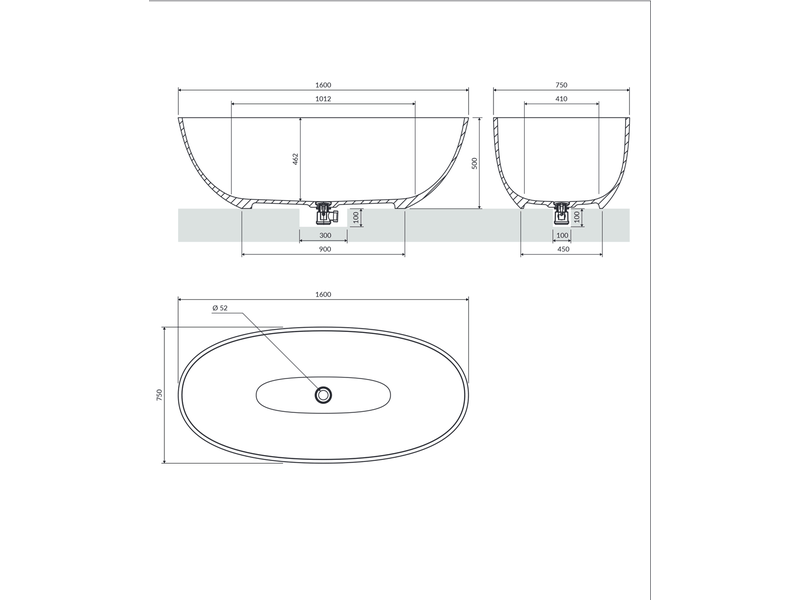 Baignoire îlot – 160 x 75 cm – shell – gris cendré mat – avec siphon inclus
