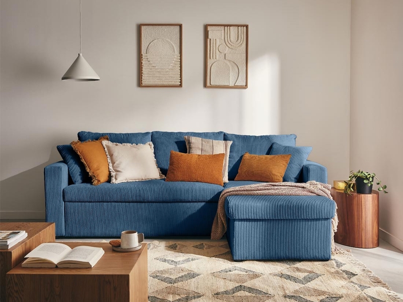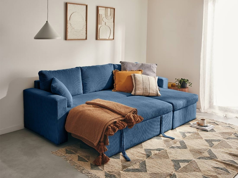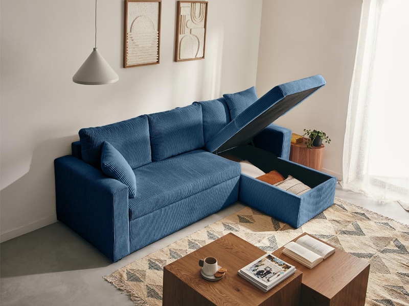 Canapé d’angle convertible en velours bleu avec coffre, réversible pour s’adapter à votre salon avec style et praticité.
