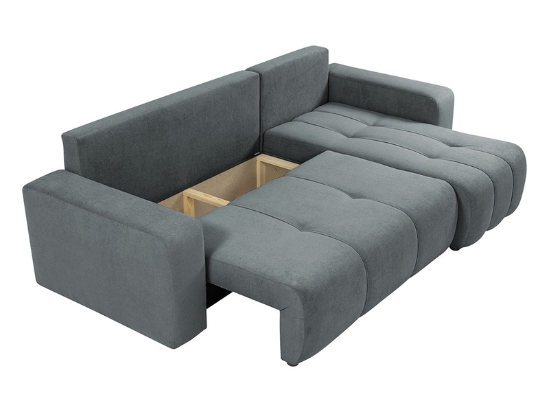 Canapé d’angle convertible 4 places en tissu gris avec coffre, parfait pour un salon contemporain et pratique.
