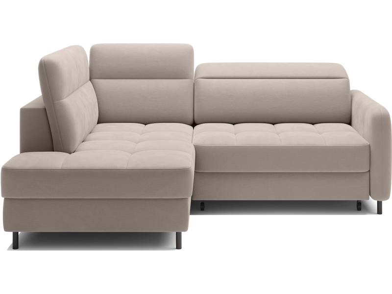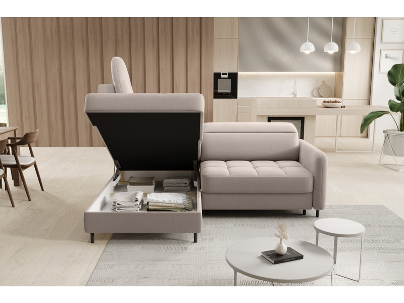 Canapé convertible 4 places en tissu taupe avec coffre de rangement. Pratique, confortable et élégant, idéal pour optimiser l’espace dans votre salon.