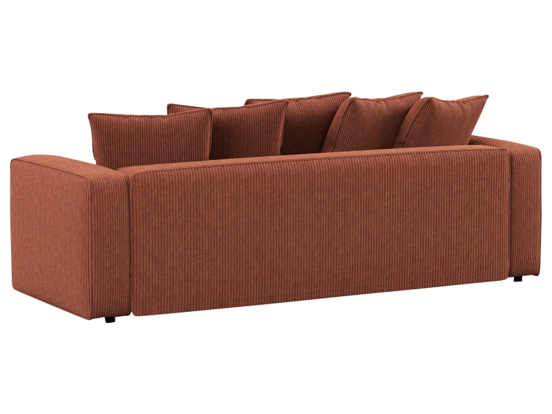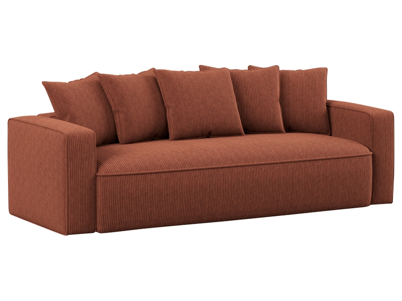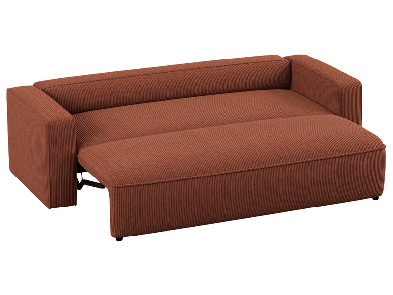 Canapé convertible 3 places en tissu terracotta, design moderne et couchage pratique.