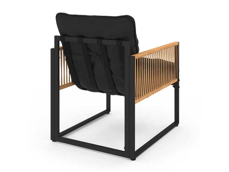 Salon de jardin bas rio 4 places structure métal noir, cordage effet rotin clair et coussins noir