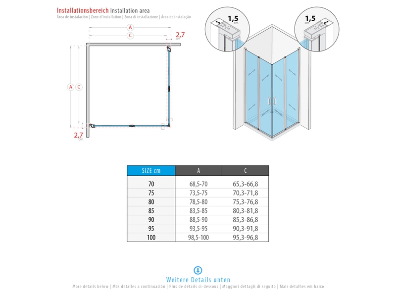La dimension (ex 80 x 80 cm) fait référence à la taille du receveur, pas aux dimensions exactes de la cabine. Le receveur doit déborder au minimum de 5 mm de chaque côté.