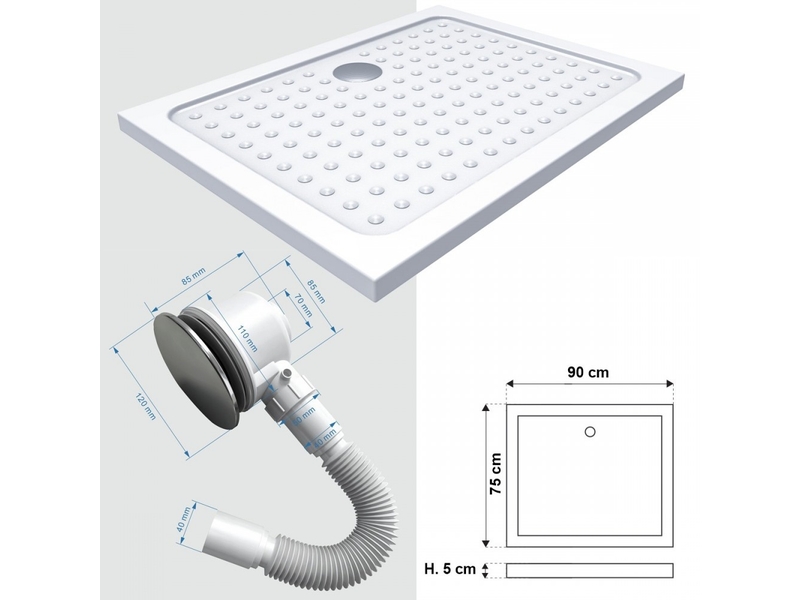 Receveur de douche SANA en acrylique blanc. Hauteur : 50 mm, à poser ou encastrer. Bonde et siphon inclus (hauteur à prévoir : 70 mm).